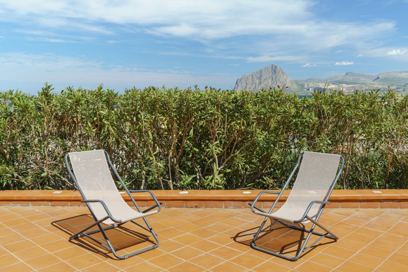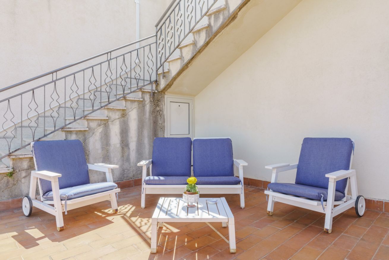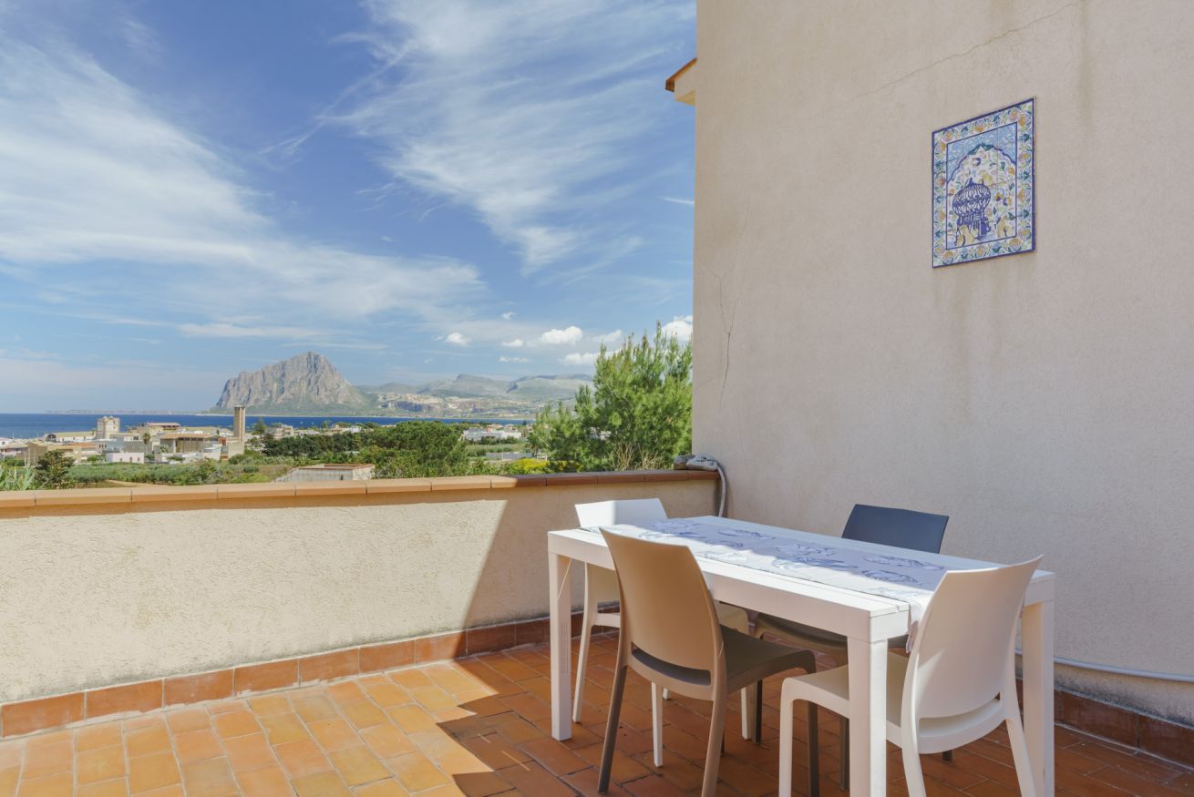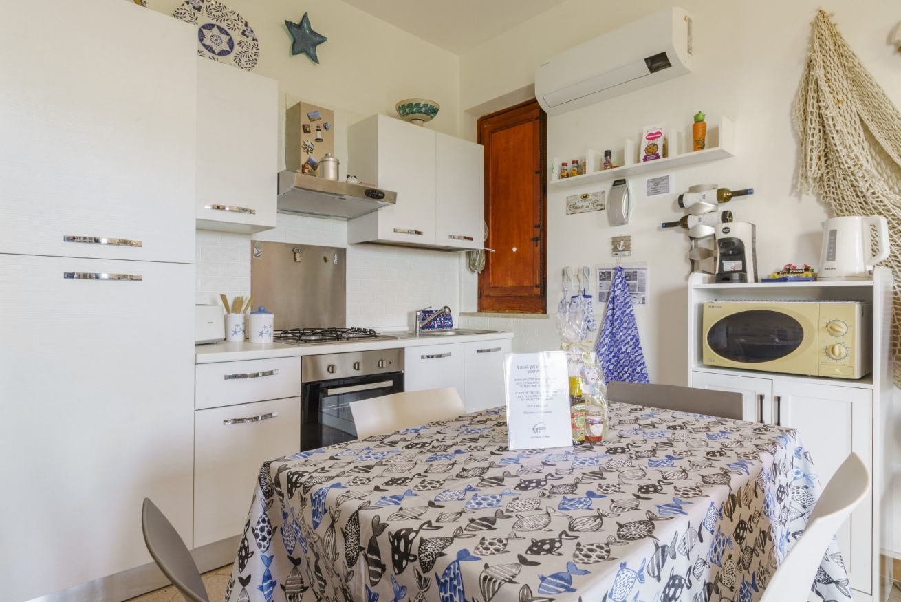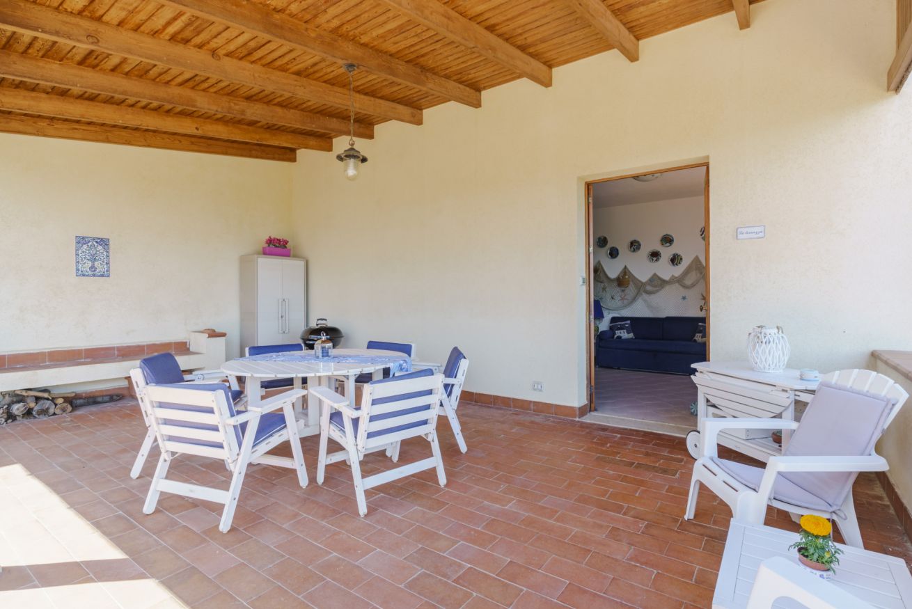 Appartamento con terrazza vista mare. Composto da camera da letto matrimoniale, soggiorno con divano letto doppio, angolo cottura, camino, bagno con doccia e lavatrice, giardino con pineta, WiFi, barbecue.